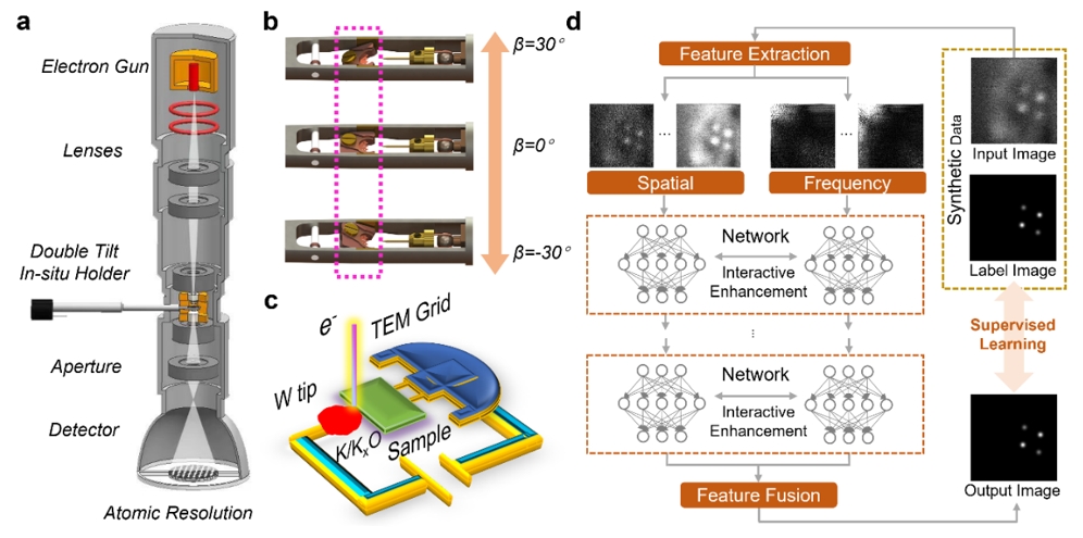 图1. 双倾原子分辨测试系统与自主开发软件AtomEnhancer用于STEM图像增强。a,双倾原位系统装置示意图。b,具有纳米机械手和β倾转功能的双倾杆模型,用于精确的带轴调控。c,原位电学操控模型图。d,AtomEnhancer方法用于STEM图像增强。