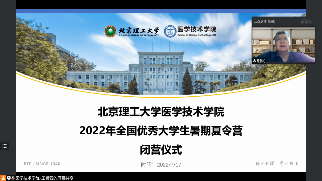 7月17日下午16时,bw必威西汉姆联官方网站betway西汉姆联官网2022年全国优秀大学生暑期夏令营闭营仪式通过腾讯会议在线上开展,betway西汉姆联官网执行院长胡斌、学院副院长陈端端以及各学科专业的相关教师出席闭营仪式。胡斌院长作总结发言,代表bw必威西汉姆联官方网站医学技术学院感谢各位同学积极参加此次夏令营活动,希望各位同学通过为期三天的活动,对我院的学科特色以及导师情况有基本的了解,后续可以继续跟学院的导师保持联系,欢迎广大学子加入北理医学技术学院。