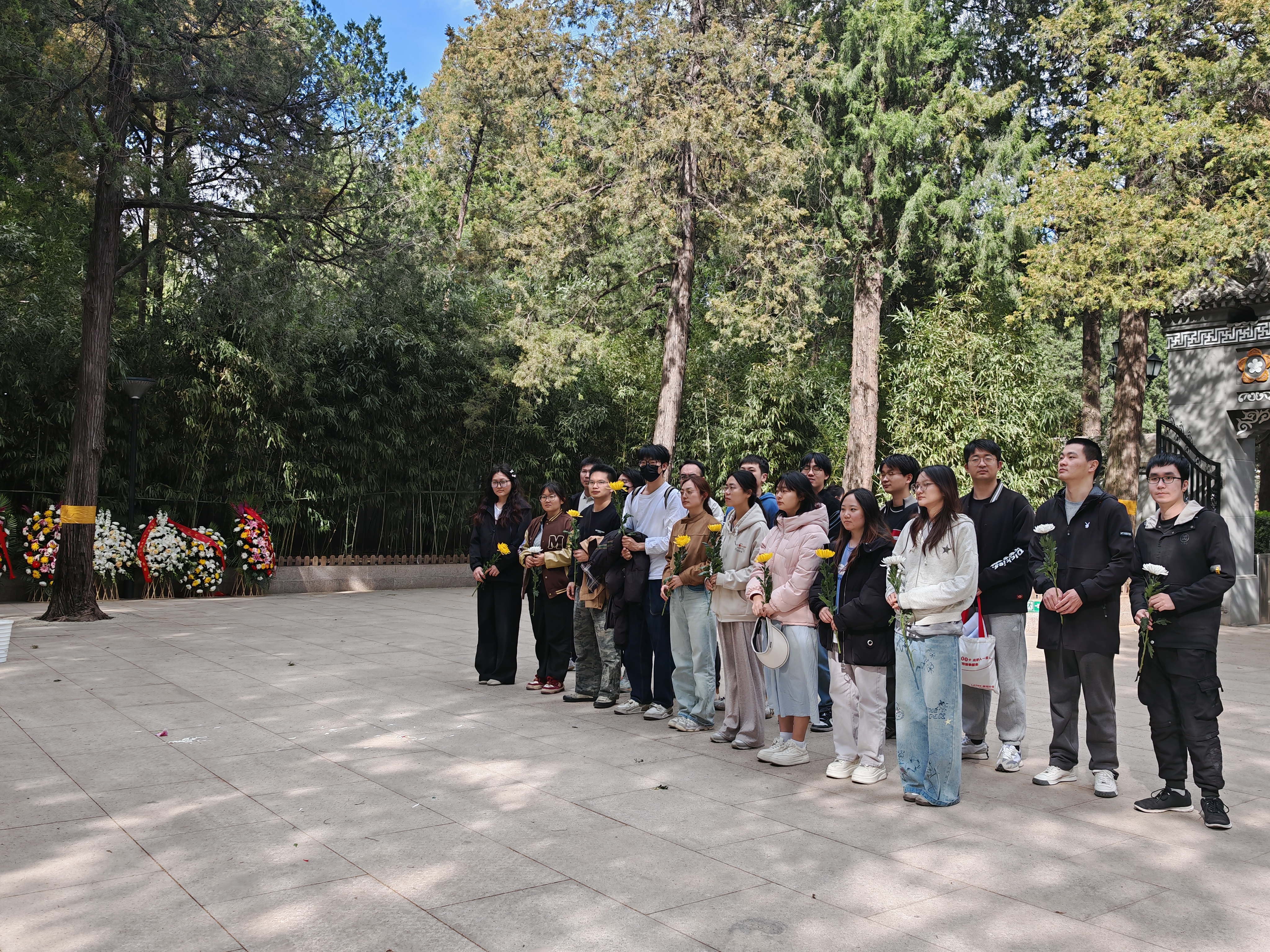 活动当日,天空澄澈,陵园内松柏挺拔、庄严肃穆。众人来到李大钊烈士公墓前,整齐列队默哀鞠躬,敬献鲜花,表达对革命先烈的崇高敬意与深切缅怀。